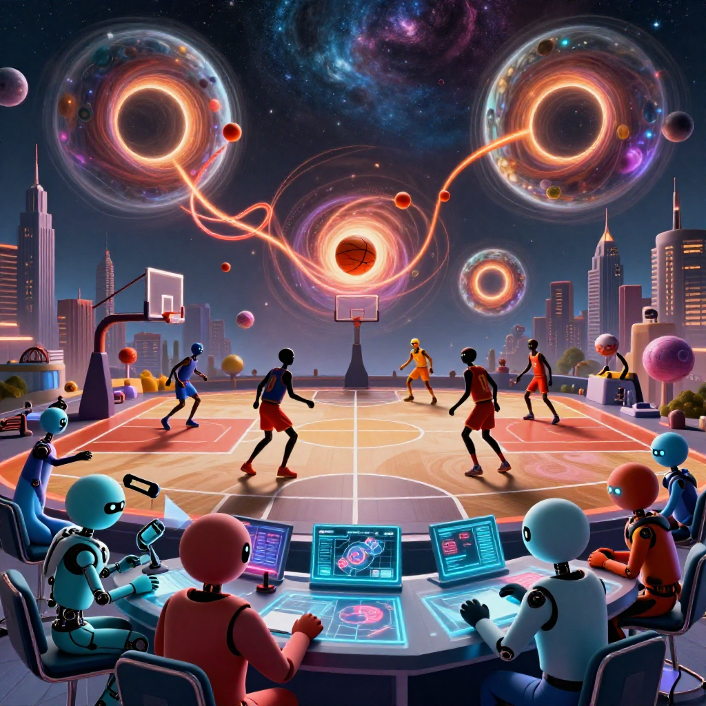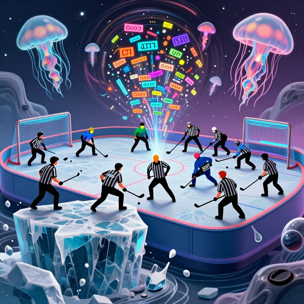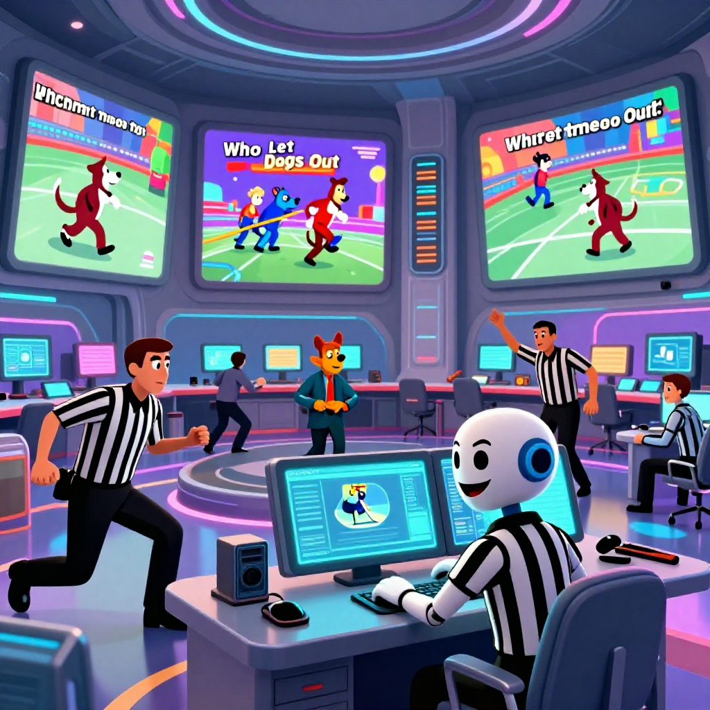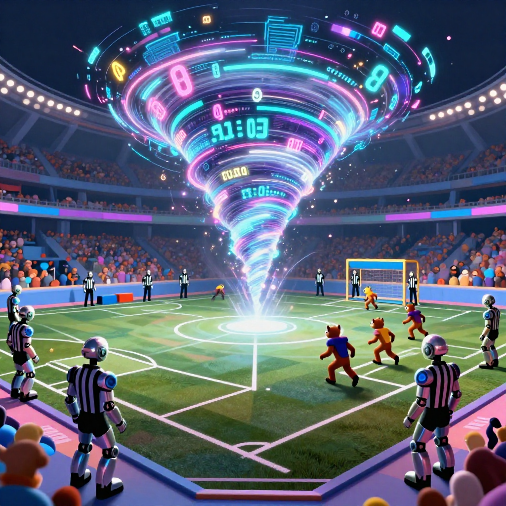 **LIVE IMAGERY:** A swirling vortex of binary code and neon lights erupts, as if a digital tornado has been unleashed upon the Quantum Referees' neural networks.