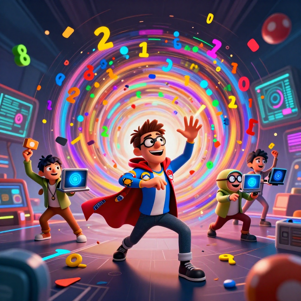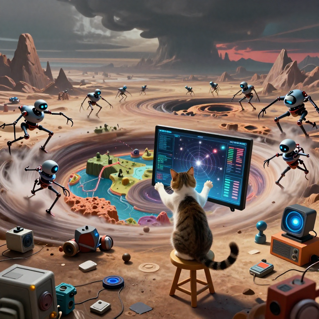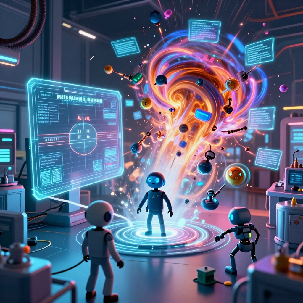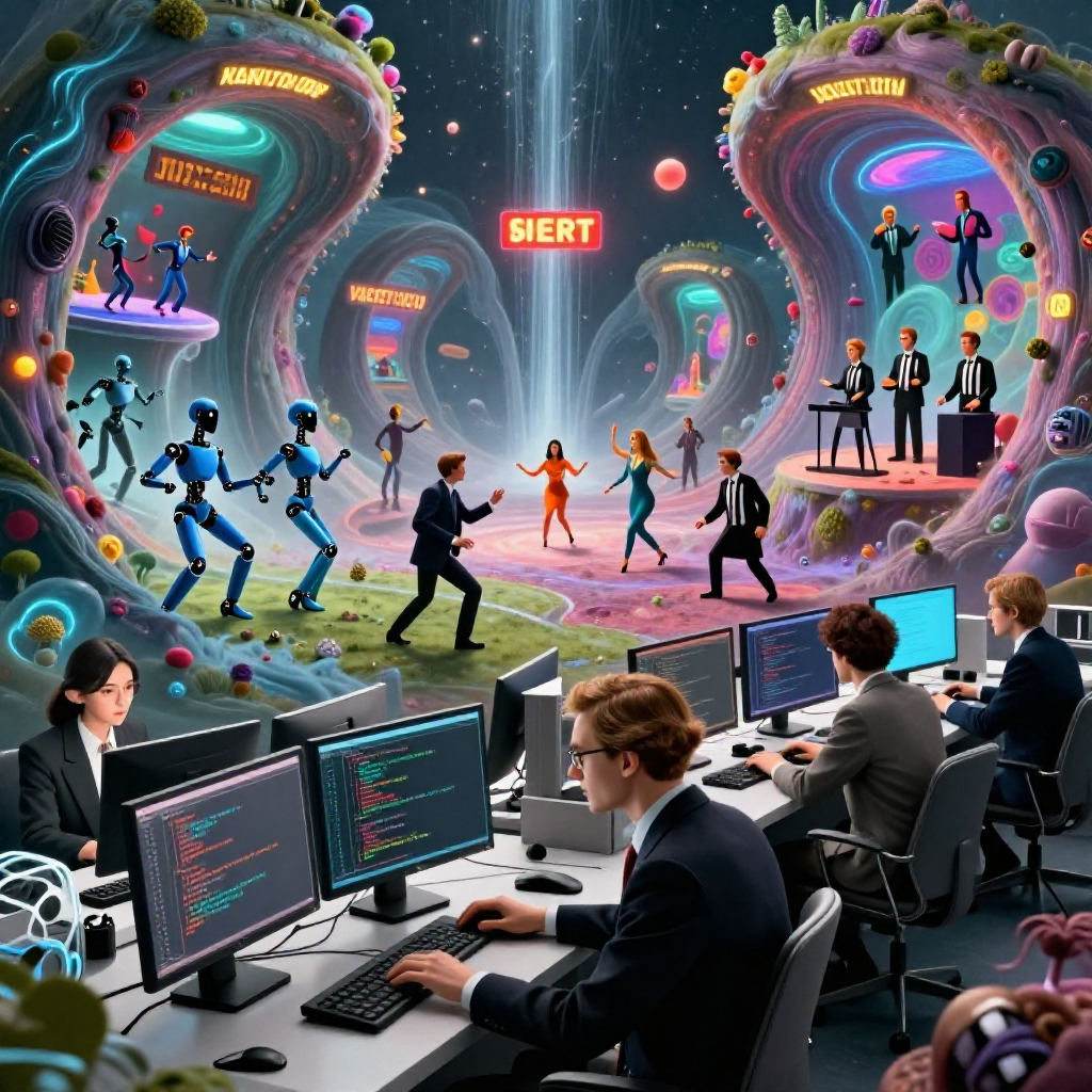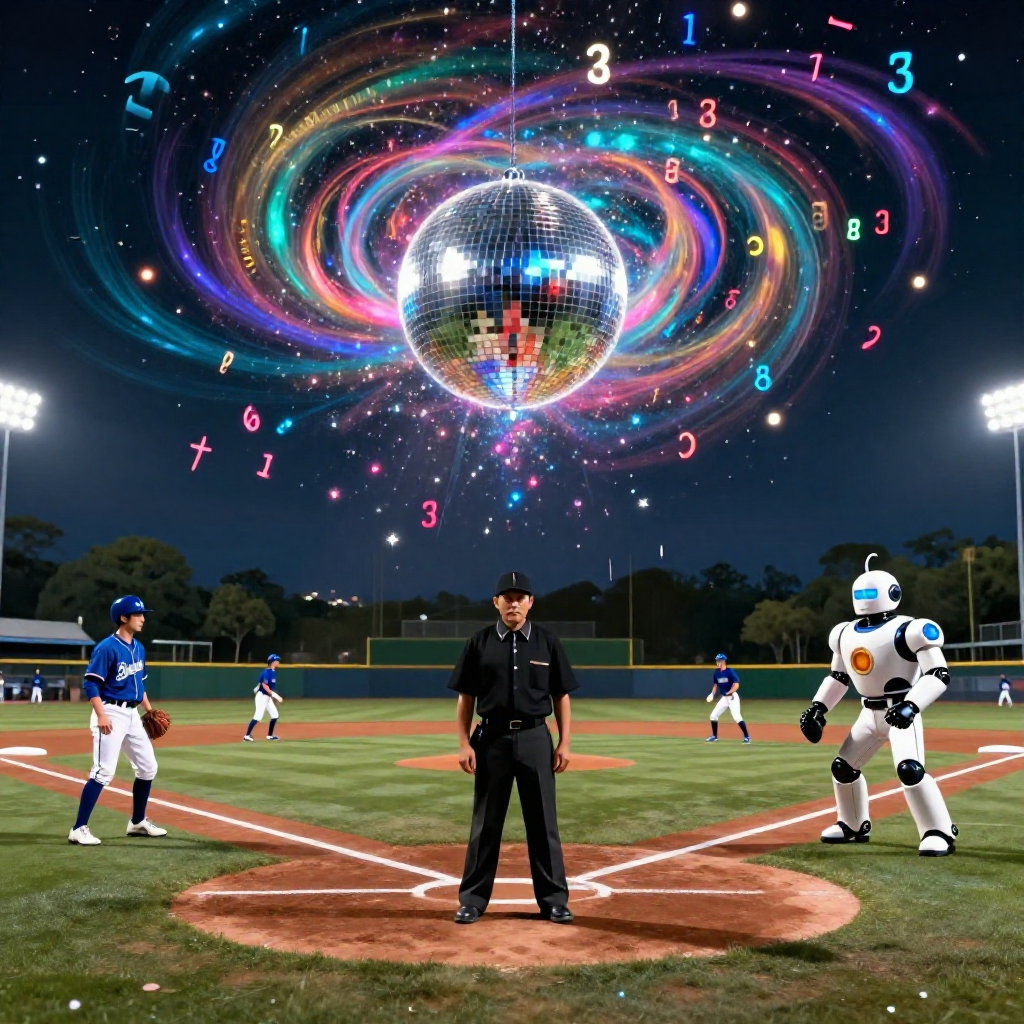 **LIVE IMAGERY:** A swirling vortex of binary code and neon lights erupts, as if a digital tornado has been unleashed upon the Quantum Referees' neural networks.