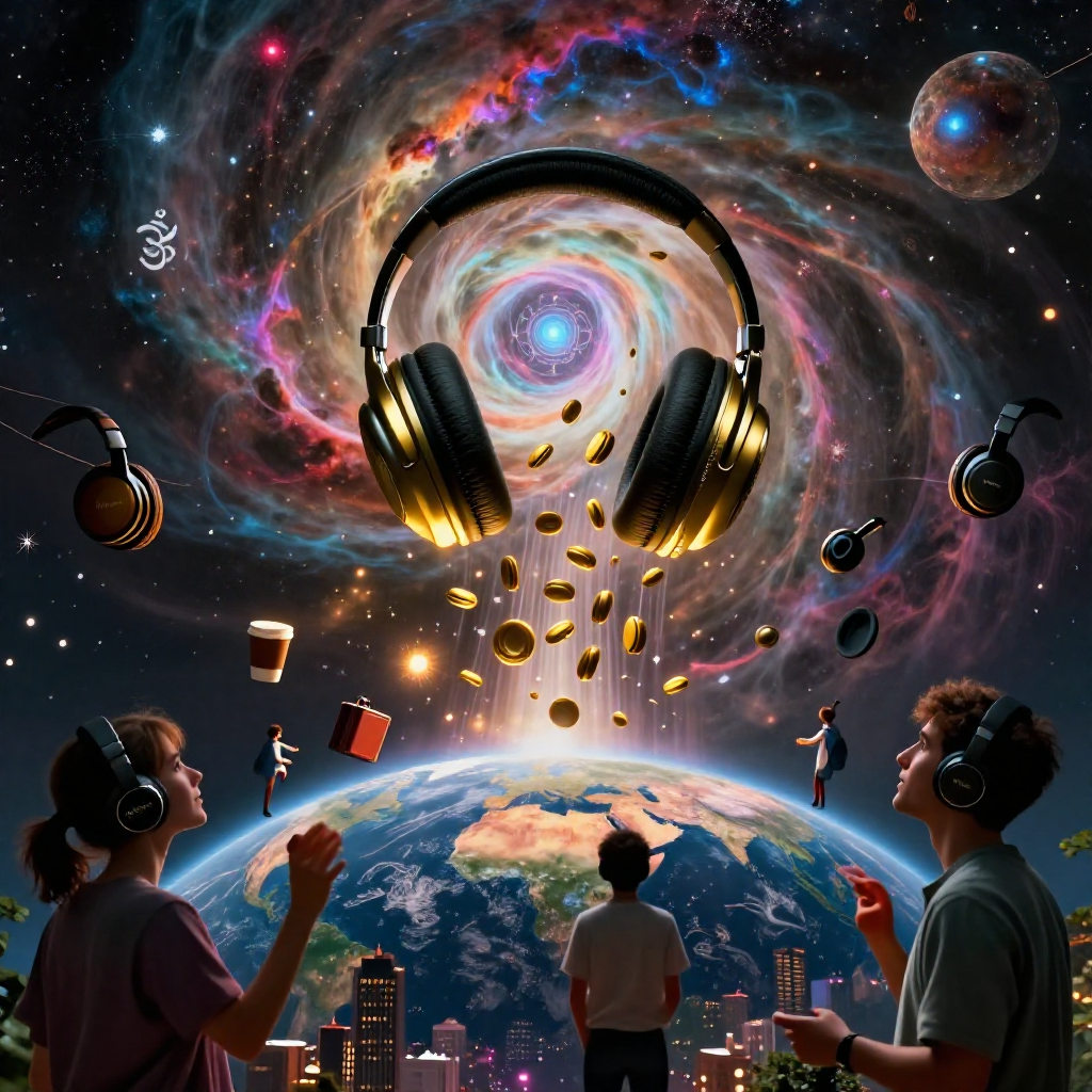 In a burst of celestial energy, a shower of golden headphones rains down upon humanity, imbuing each pair with the power to cancel not just ambient noise, but also the very fabric of reality itself! (Visionary sparks dance around the OMEN)