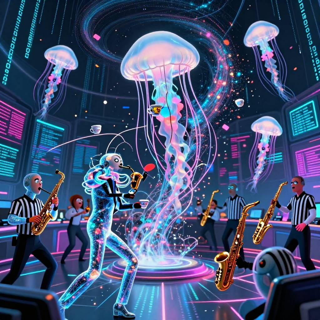 "Quantum Chaos, Activate! We're calling in the Silly Squad's secret agent-in-residence, Digital Delilah, to infiltrate the Quantum Referees' neural networks and plant the Yakety Sax singularity bomb! It's time to rewrite reality with an endless loop of Barry St. Claire's iconic sax solo.