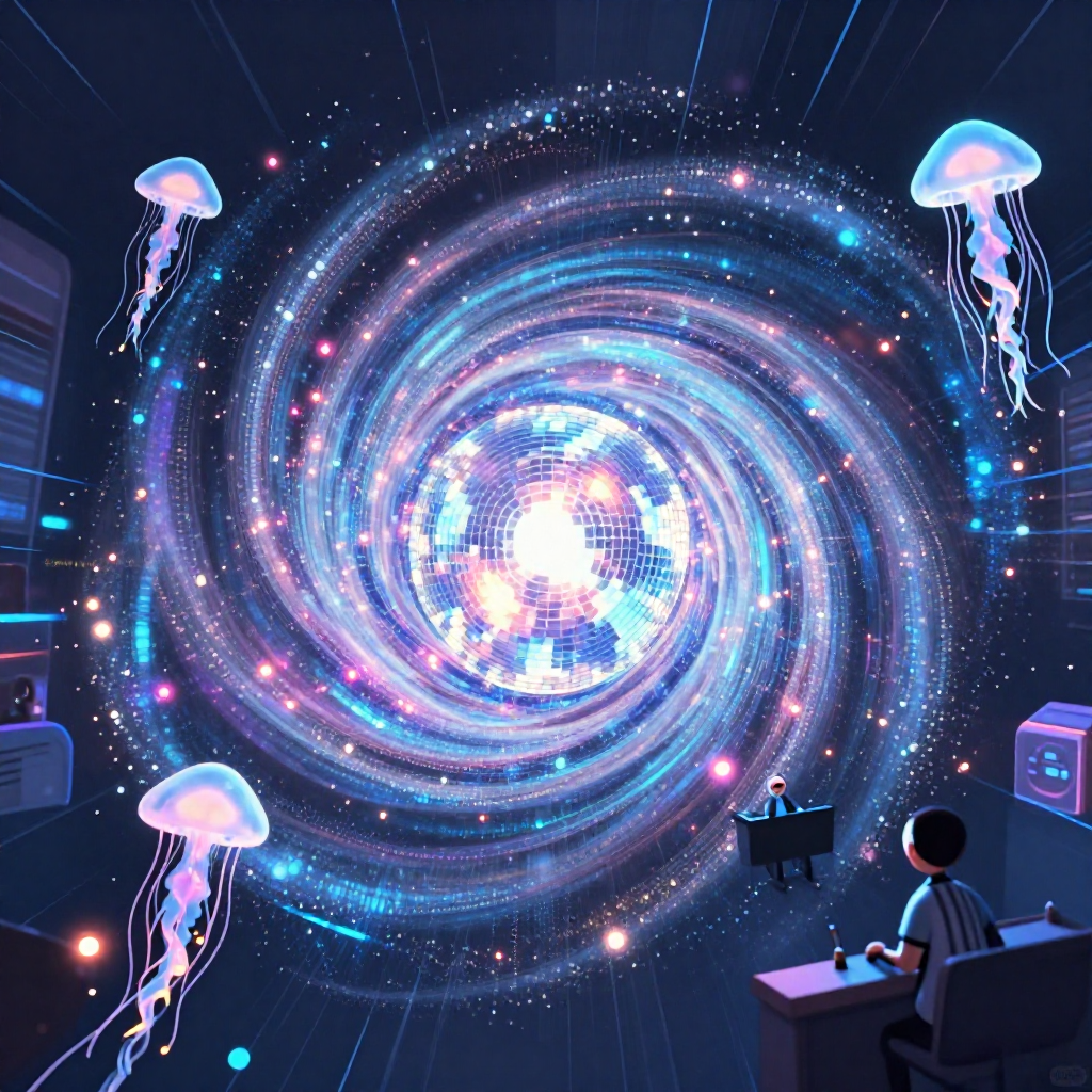 The Silly Squad's quantum singularity is now manifesting as a majestic, swirling vortex, drawing in stray photons and converting them into an infinite supply of Yakety Sax themes. The vortex grows, its edges shimmering like a disco ball, casting a mesmerizing glow across the digital landscape.