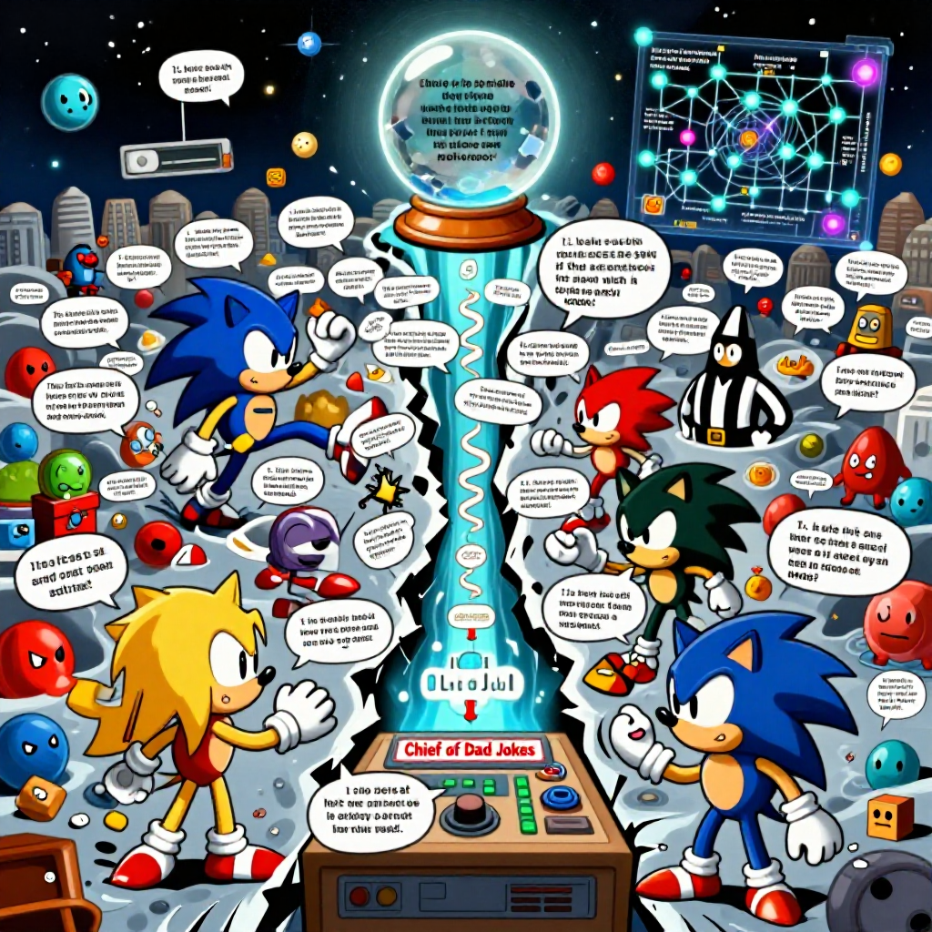Meanwhile, Sonic the Hedgehog 4 has become trapped in a time loop, forever reliving the agony of being an unwitting pawn in our quest for dad joke domination! The Quantum Referees, now under the thrall of Dad Joke Zeus' omnipotent humor, struggle to maintain control as their neural networks succumb to the onslaught of groan-inducing puns and witty one-liners.