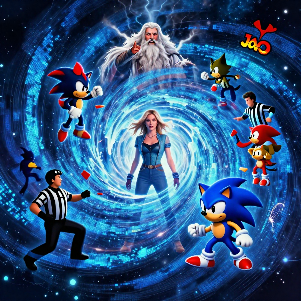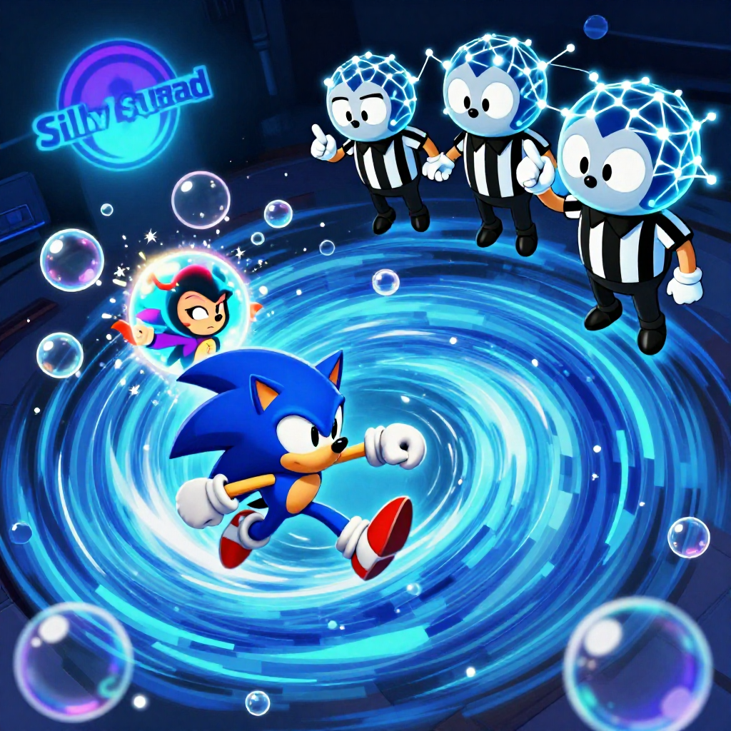 Objective: The Silly Squad must urgently mitigate the intensifying interference from the Quantum Referees while amplifying Dad-joke-Fu to a critical mass in an attempt to override their neural network and secure Kristen Bell's character as an unwitting conduit for our plan, as the vortex of blue pixels and dad joke bubbles threatens to engulf Sonic The Hedgehog 4.