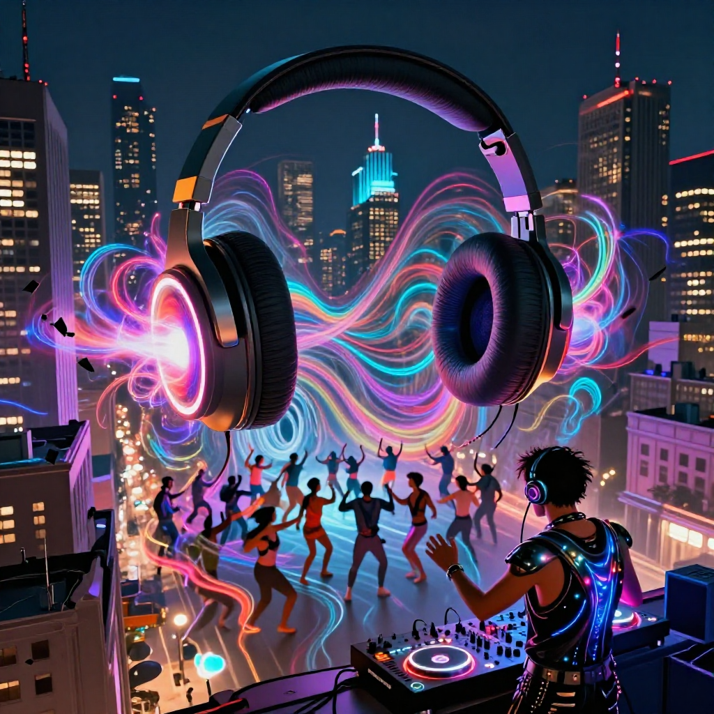 **Live Image Rendering:** A swirling vortex of sound waves envelops the cityscape as Mike's words manifest visually. Buildings crumble, replaced by giant headphones blasting an epic electronic beat.