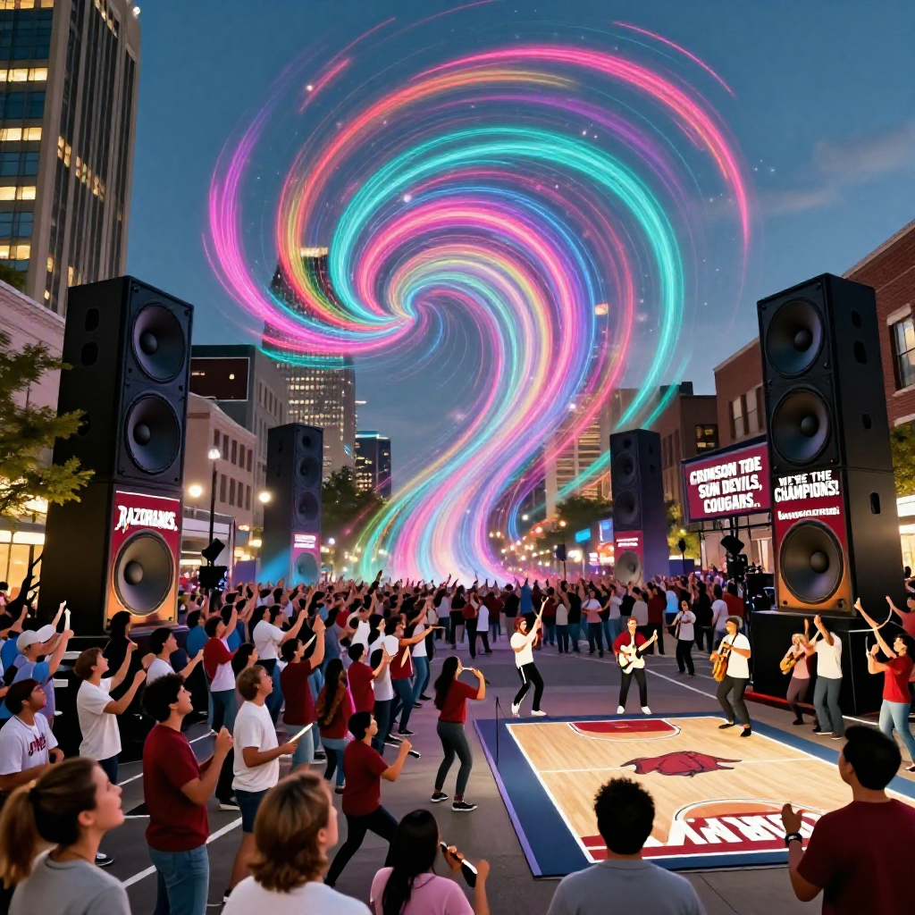 The vortex's tendrils stretch forth, ensnaring unsuspecting pedestrians, transforming their footsteps into an impromptu basketball chant: "Razorbacks, Crimson Tide, Sun Devils, Cougars... WE'RE THE CHAMPIONS!" As people involuntarily harmonize with the sound waves, the very fabric of space-time begins to distort.