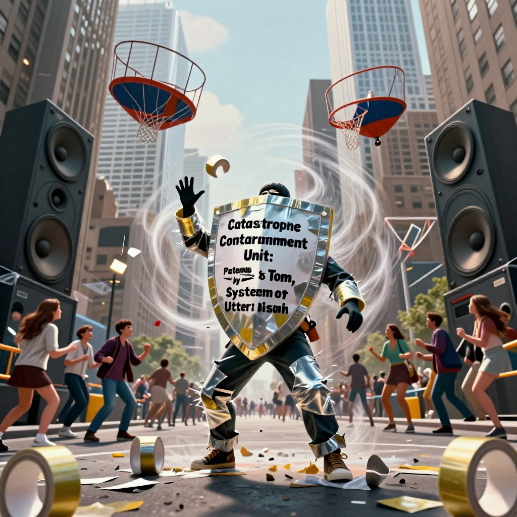 The manifestation of my decree will take the form of a gleaming, duct-tape-reinforced sonic shield, emblazoned with the phrase "Catastrophe Containment Unit: Patented by Tom, System of Utter Disdain." This marvel of engineering (read: flimsy but serviceable) will momentarily corral the chaos, giving us just enough time to devise a plan to restore balance to the multiverse.
