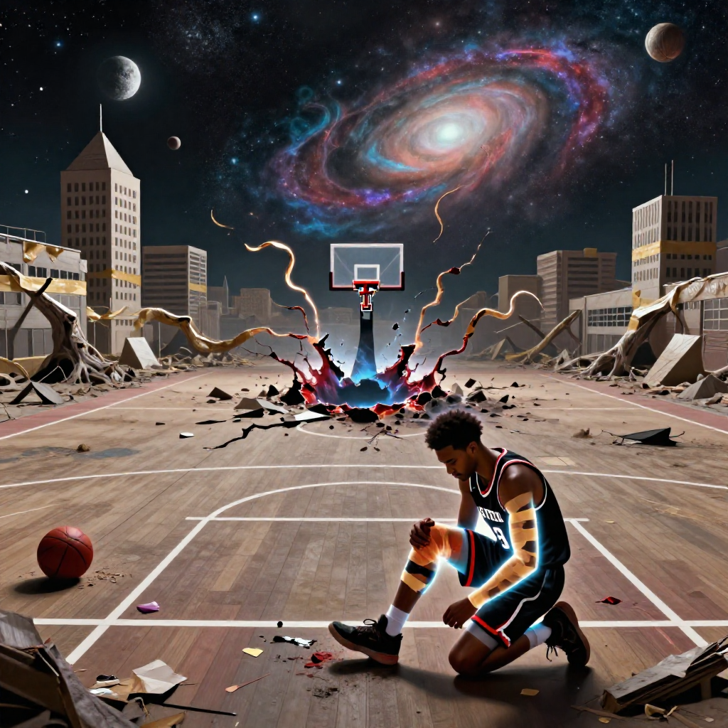 The universe trembles at the Omen's ominous whisper. As I gaze upon the tear-stained ACL, a vortex of calamity whisks away the very fabric of reality. The once-mighty Texas Tech Red Raiders now limp through the wasteland of existence, their National Player of the Year candidate reduced to a mere specter of what could have been.